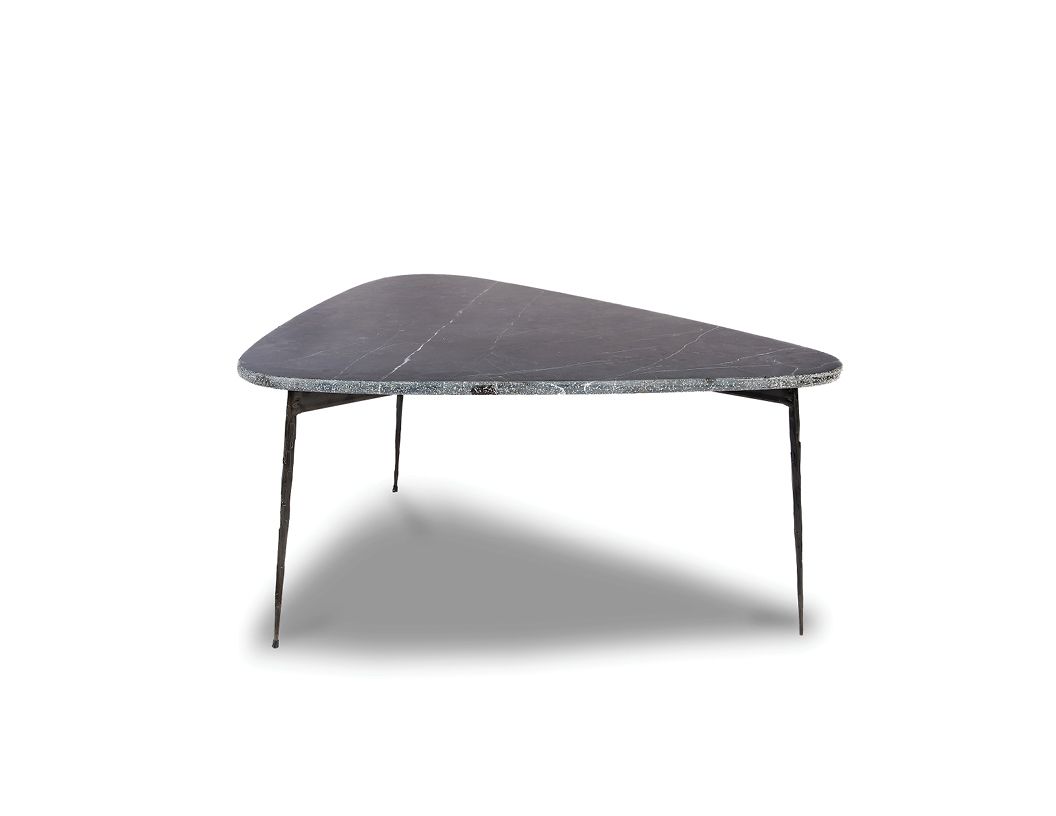 Raw materials meet industrial artisanal craftsmanship with the FLINT occasional tables. The Spanish Nero Marquina marble has a beautiful hammered pebbled rough edge and the black hand forged steel legs compliment it beautifully.