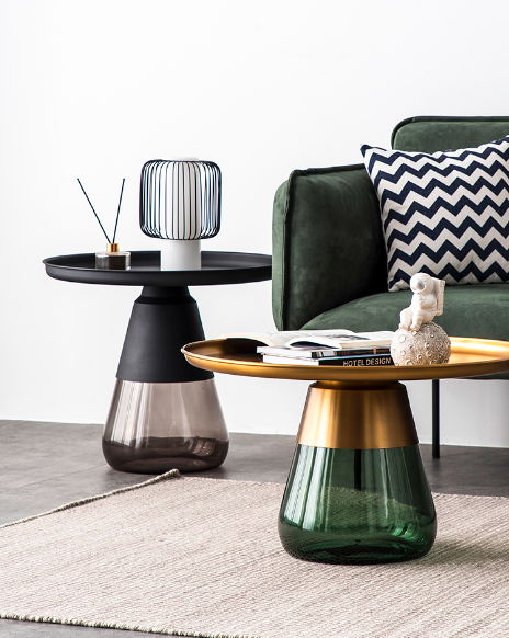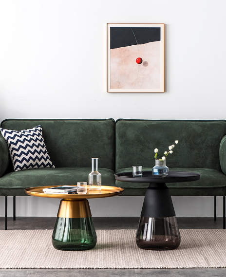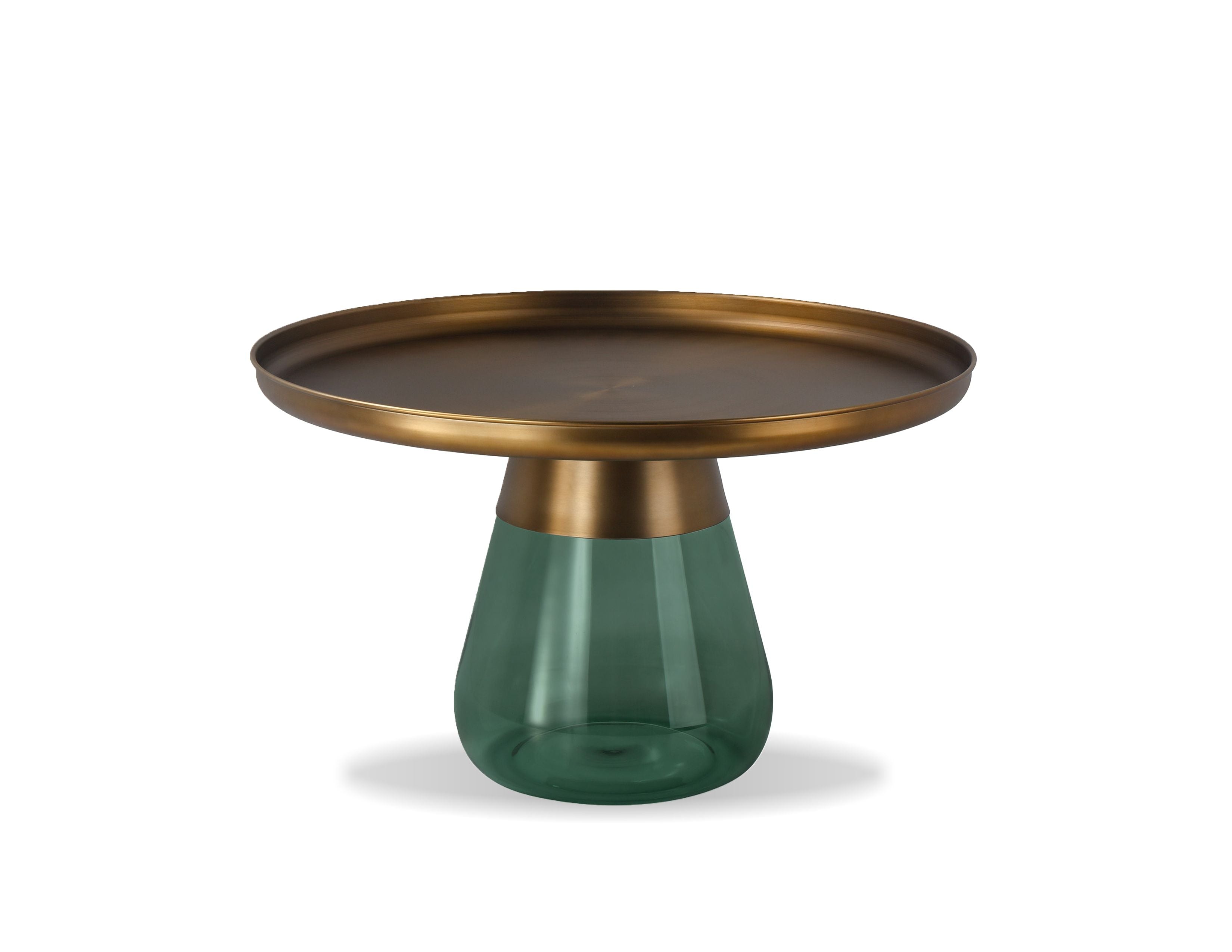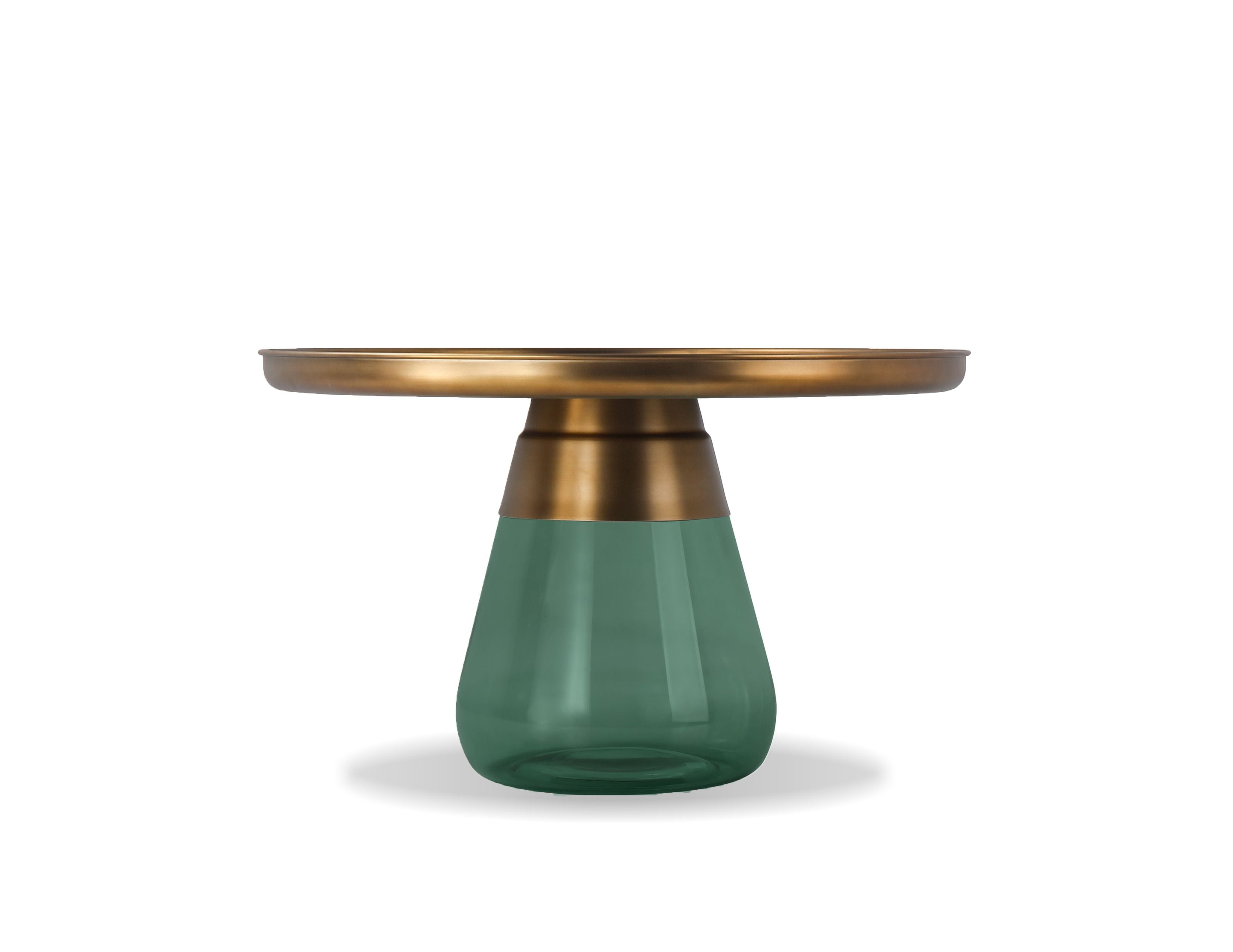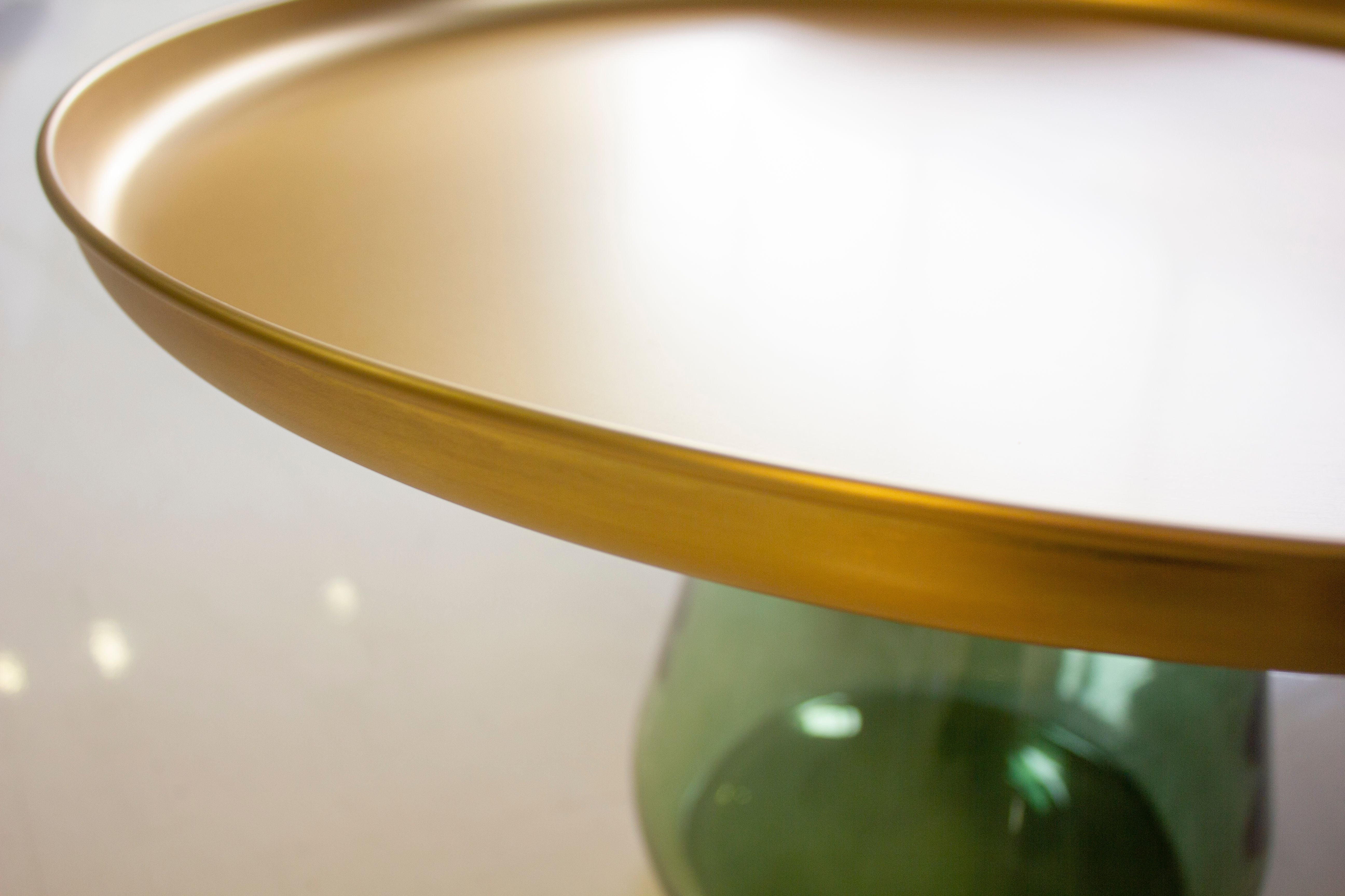 The Duverre series is made from beautifully hand blown glass and light weight spun aluminum tops. They pair and nest beautifully together for statement or just as a single table on its own. You can choose from smoked glass or transparent green bases and choose tall tops or low in powder coated matte back or brushed gold electroplate.