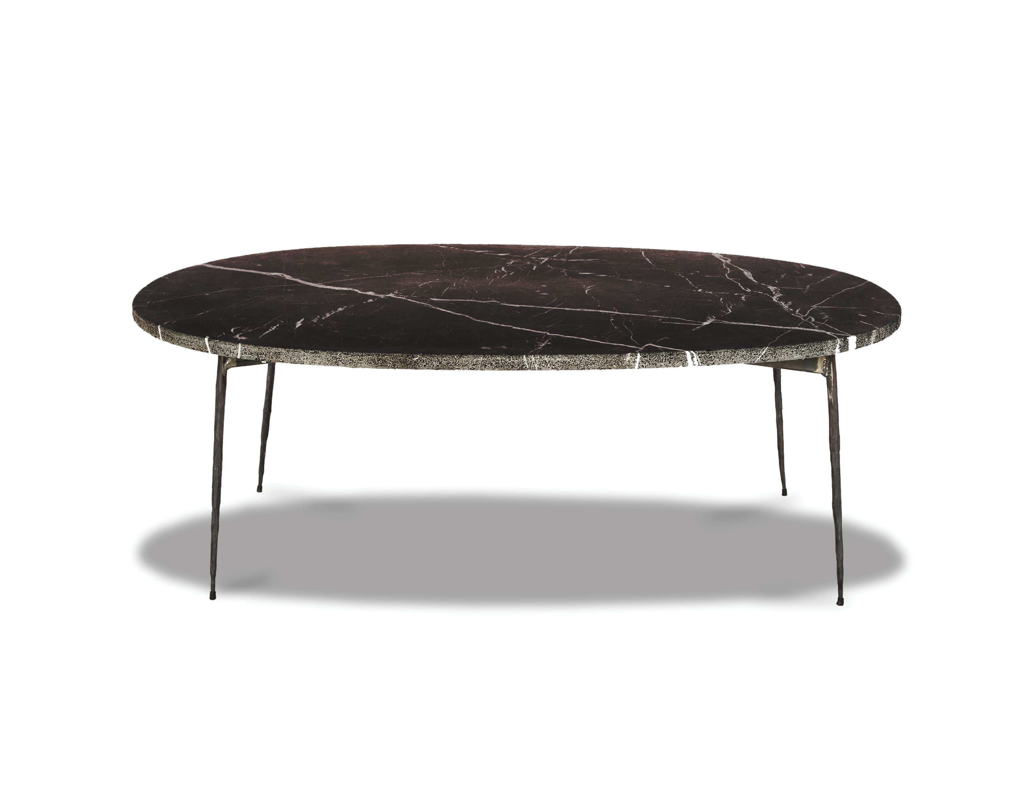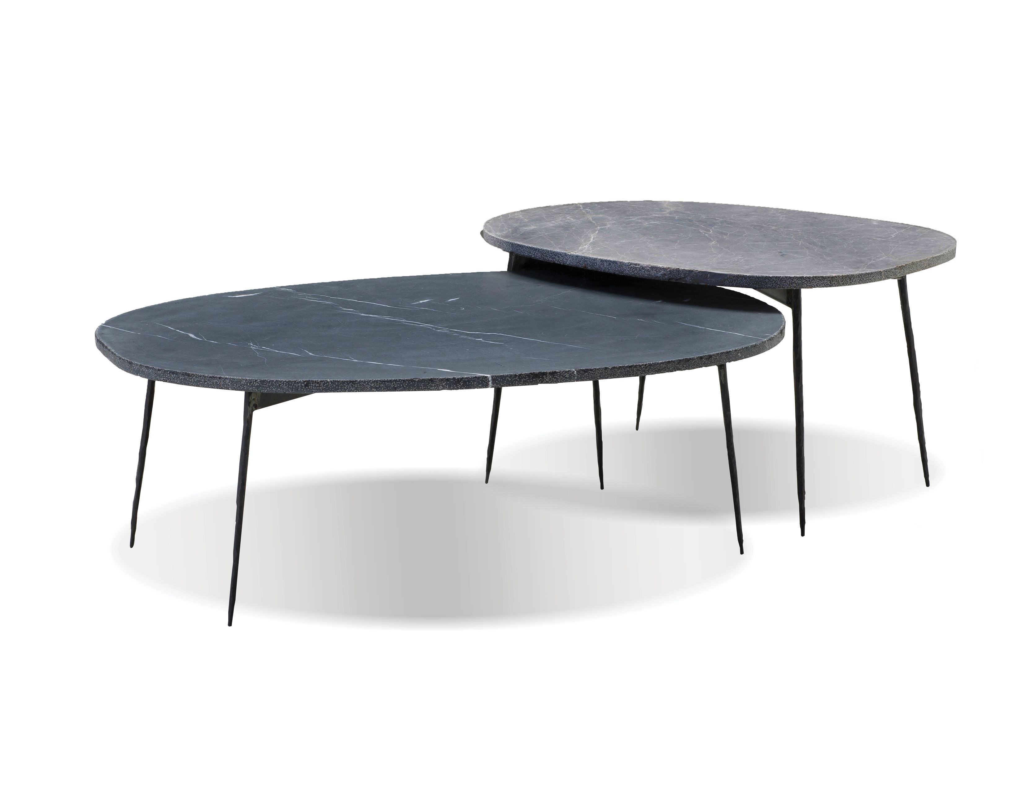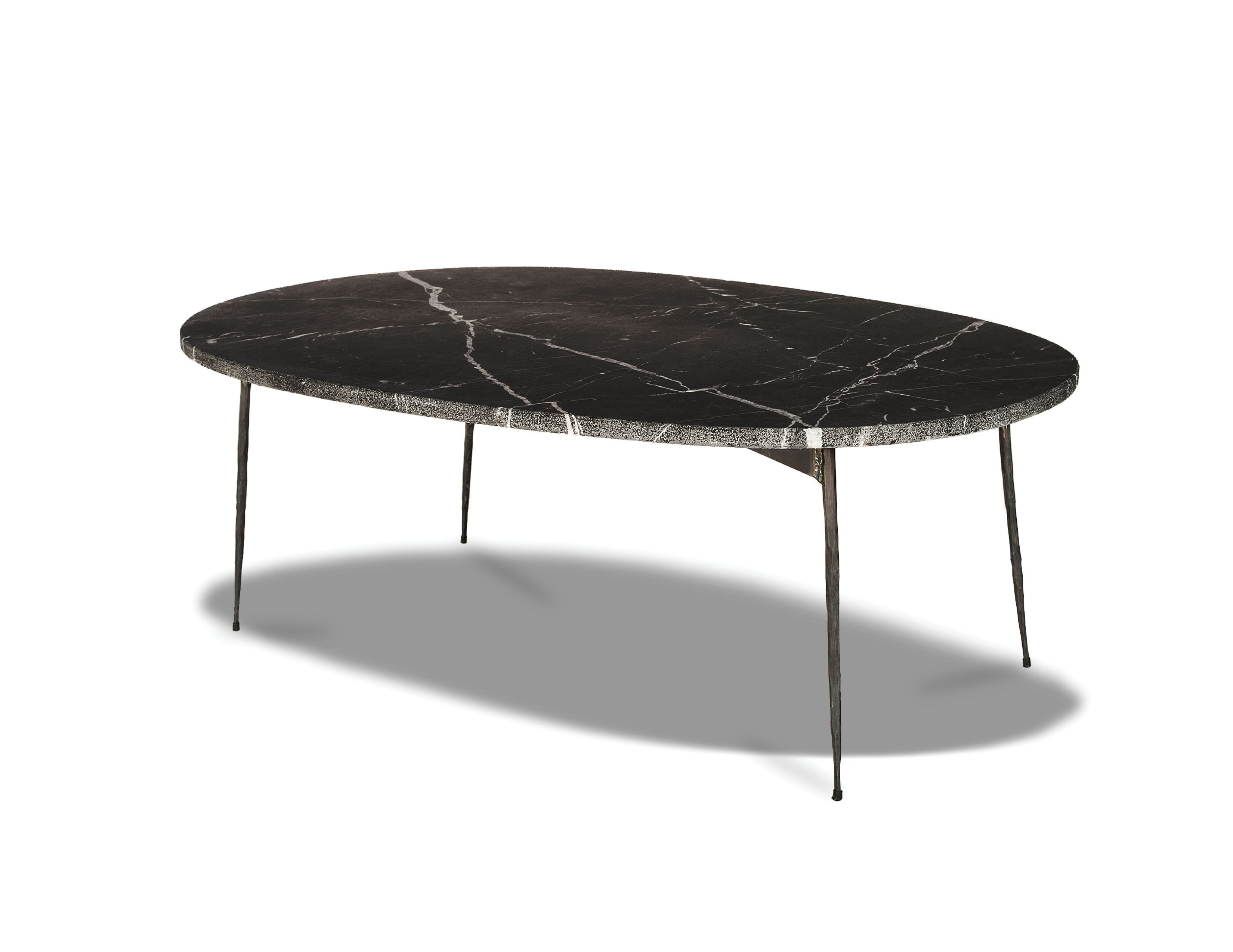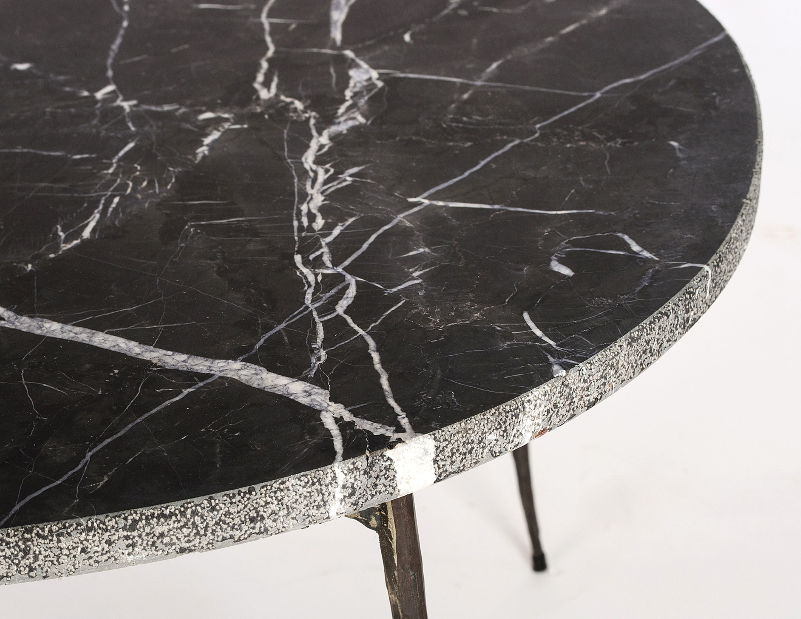 The TUK TUK tables are artisanal masterpieces. The base is forged hammered steel with elegant points down. The black Marquina Spanish marble has a honed finish and a natural shape, the edge detailing is sand-blasted giving the tables their hand made appearance.
