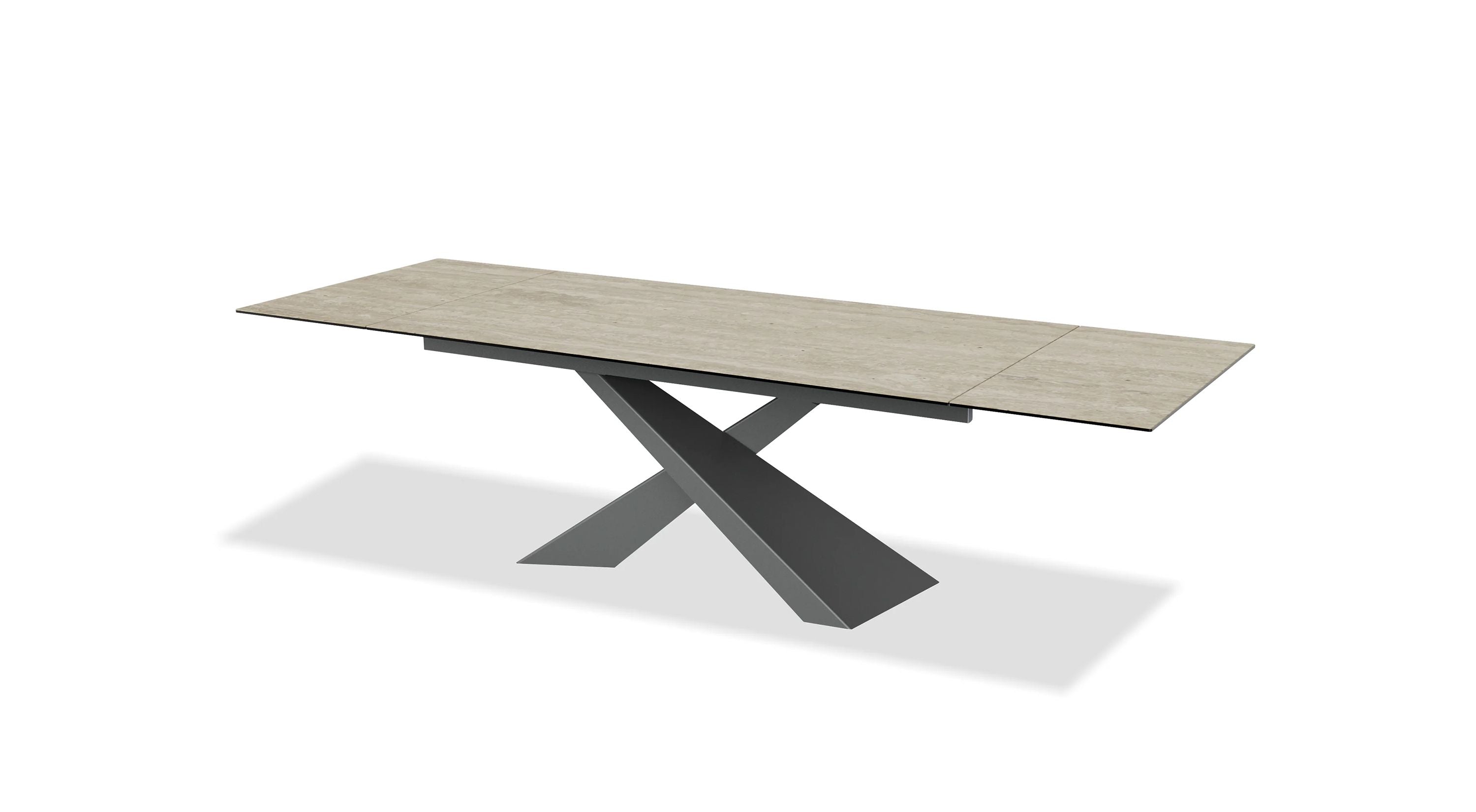 The CENTURY Dining Table features a matte black powder-coated steel base with an artistic design, and is available with either a travertino or noir desir ceramic top. Its extendable leaves allow seating for 8-10 people, and the ceramic top offers durability and resistance to scratches, stains from day to day use. A great table to busy households that still want an elevated look.