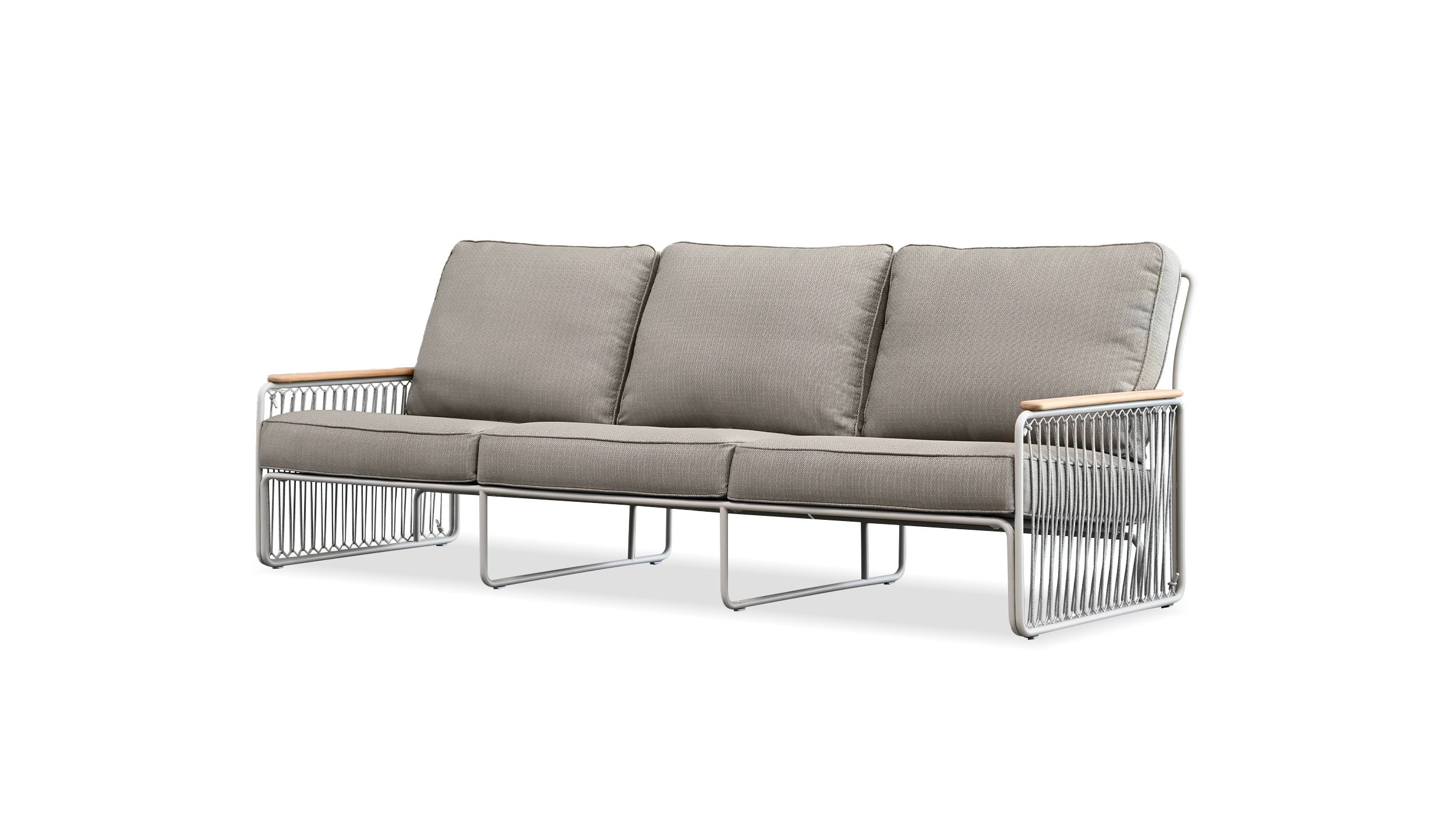 The Lucerne Outdoor Sofa features sandhill sunproof fabric that goes with everything, paired with a warm teak armrest and a steel frame powder-coated in sandhill for a cohesive, durable finish. This collection also includes a matching lounge chair and coffee table set that pair perfectly to complete the outdoor seating ensemble.