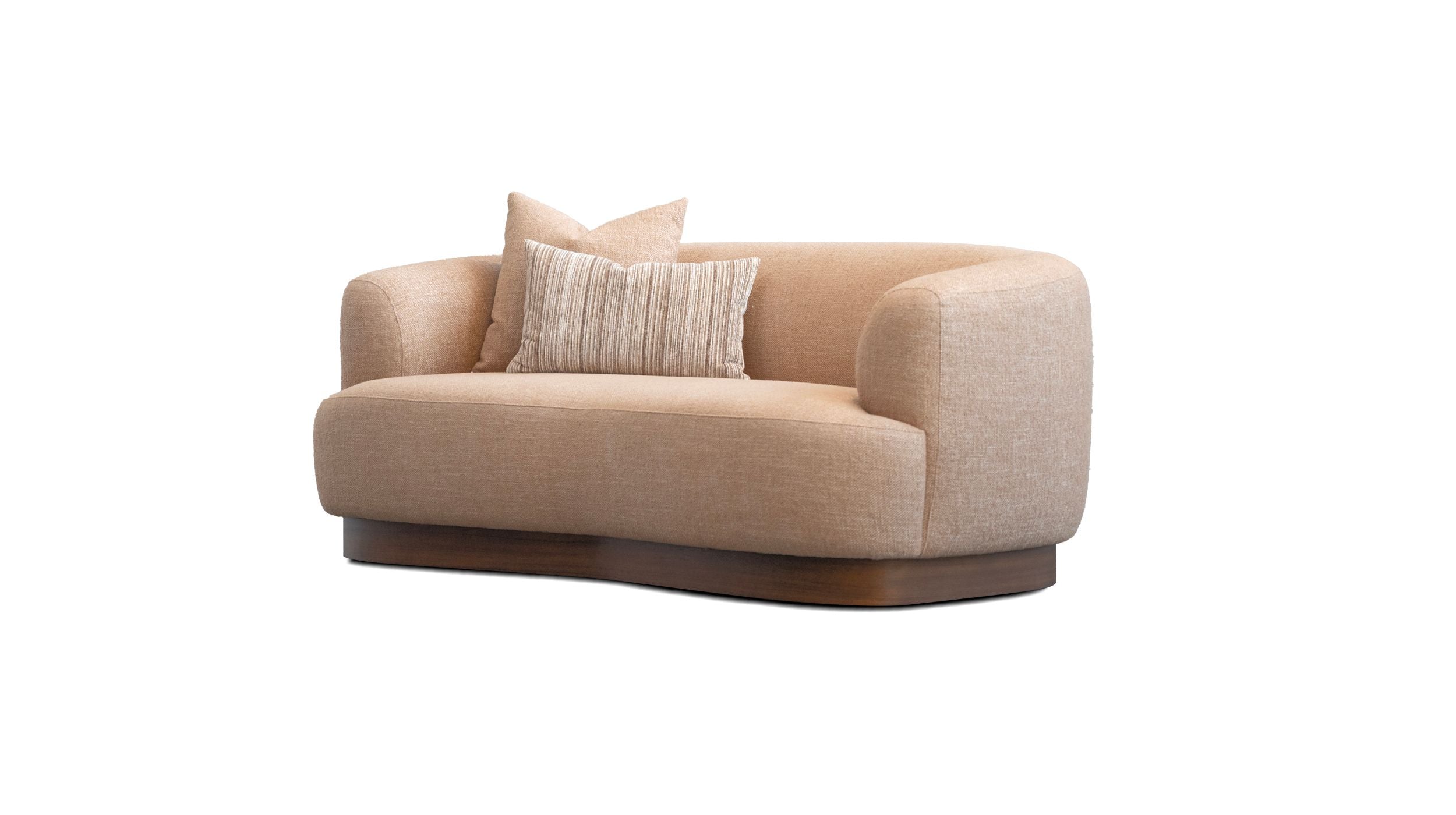 The PED collection includes a sofa, loveseat, and armchair, all featuring a unique curved walnut base with a linear wood grain that complements the body's curves. Upholstered in a warm, retro chenille fabric, this collection offers a cohesive design. Pair it with one of our wood coffee tables like the COUPE to keep a natural organic look.