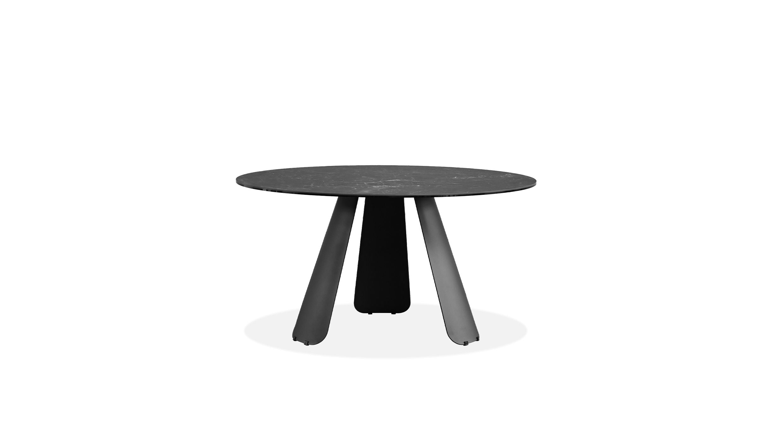 The Palazzo Round Ceramic Dining Table is a stunning and modern piece of furniture that will elevate any dining room. The table features a slate grey ceramic top that is not only beautiful but also durable, ensuring it will withstand daily use. The 55-inch diameter table seats up to 6 and offers ample space for dining and entertaining guests. The table's minimalist design is supported by three steel matte black powder-coated legs and is perfect for those who desire a modern and sophisticated look in their dining space. This table is also available in a larger rectangular top.