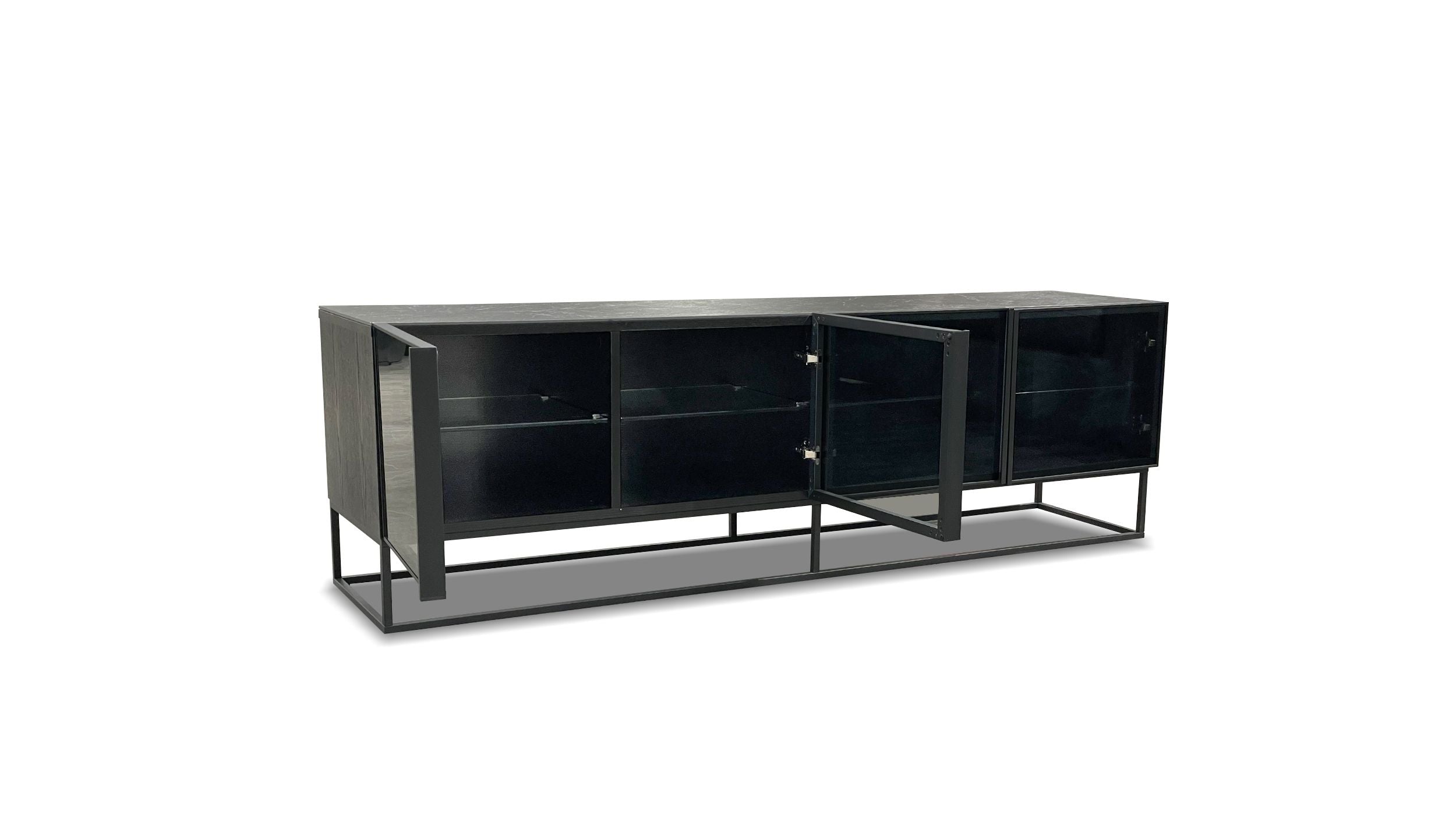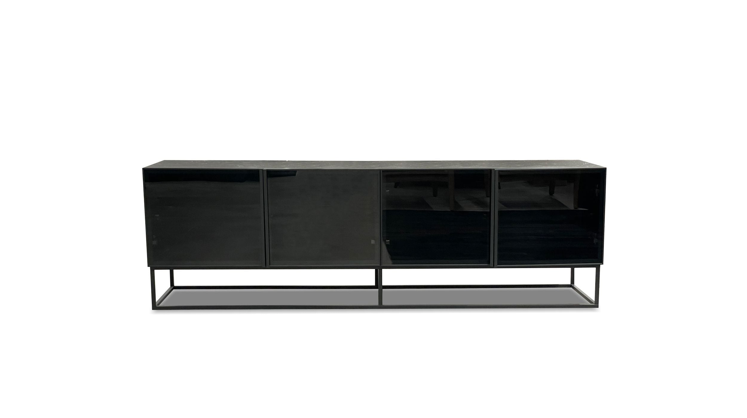 The Barker TV Unit is the ideal media unit for today's home. It has a Black ceramic top with a slick metal frame that floats the unit in the air. It is equipped with smoke glass doors , convenient with remotes and a black ash wood finish around the sides to give it an astounding presence.