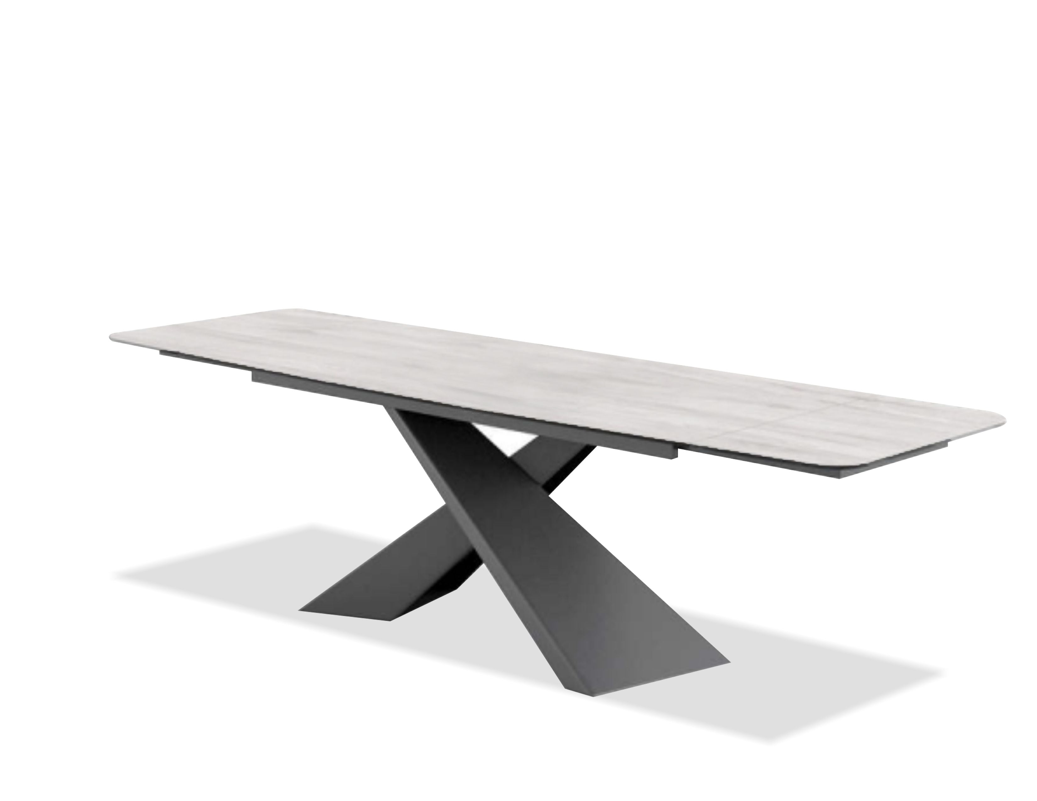 CENTURY Dining Table with its wild Noir Desir Black or the white Carrara ceramic top is a statement table by itself. Serves up to 12 people with its double side extensions.