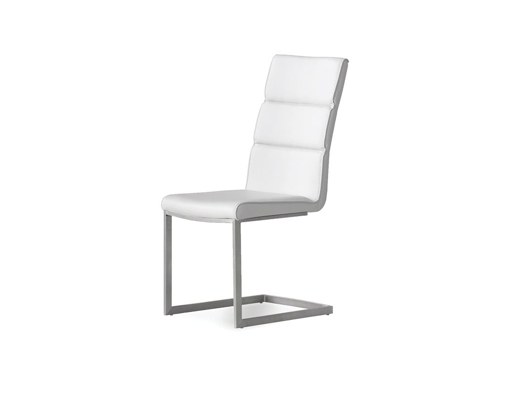 The DUOMO chair in grey or white is upholstered in a easily maintained leatherette with a baffle tufted back detail. It features a U-shape base finished in brushed stainless steel and has a bit of flex in the seat for extra comfort.