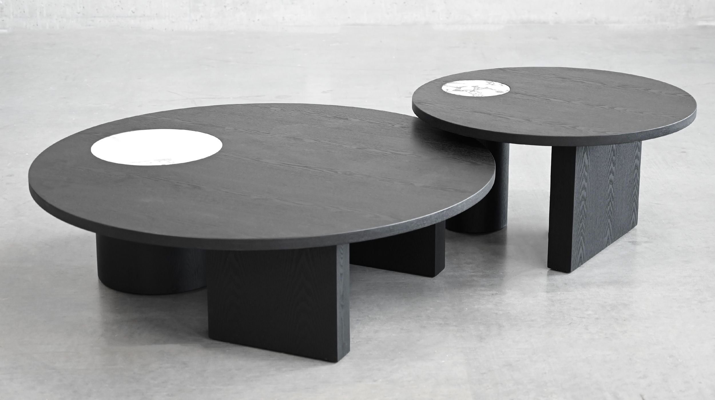 The FELIX collection offers both small and large coffee tables in black ash, thoughtfully designed to nest seamlessly together, thanks to their varying heights. These tables feature a bvlgari ceramic inlay on the top in a circular shape.