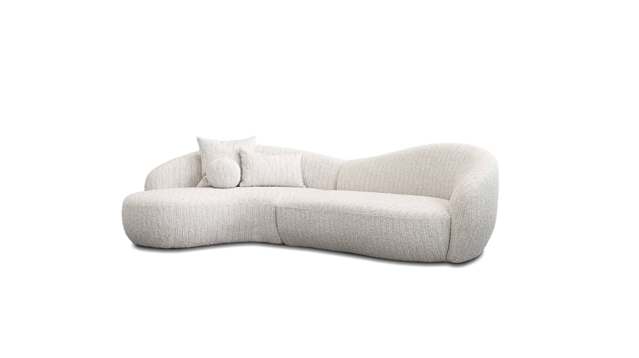 The LOOP sectional is available in both left and right-facing configurations, making it versatile for various spaces. Upholstered in luxurious striated boucle in Swiss Coffee, it offers a perfect balance of bold presence and cozy comfort for those seeking an impactful piece in a more compact size.