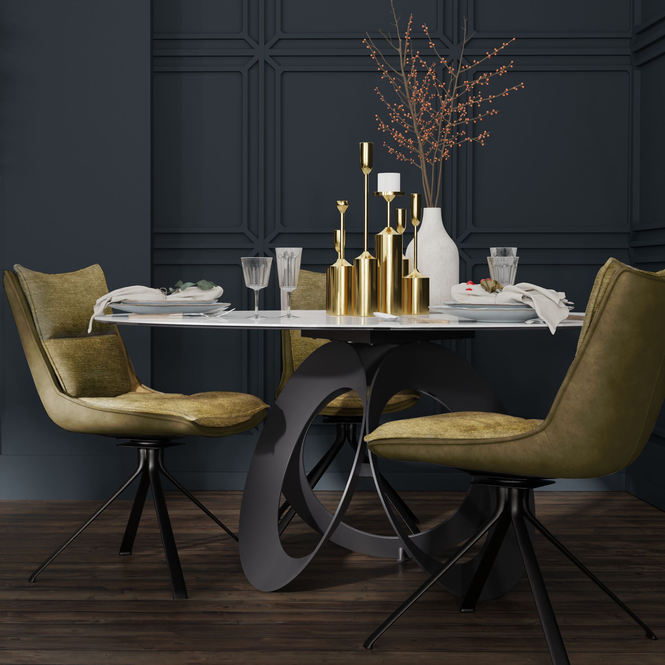 The Puccini Swivel Dining Chair is a stylish and comfortable addition to any dining room. Available in two fabric options, Rhino in ultra suede and Evergreen in tweed and nubuck fabric, both options provide a luxurious feel. The chair features a comfortable padded seat and back design, ensuring maximum comfort during long dinners or gatherings. The black powder-coated legs provide a sturdy base while also adding a modern touch to the chair's design. The chair's swivel feature allows for easy mobility, making it convenient for guests to move in and out of the dining table.