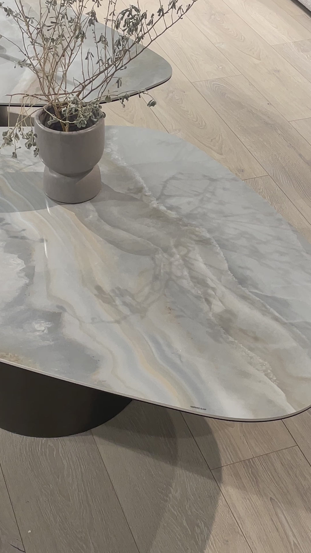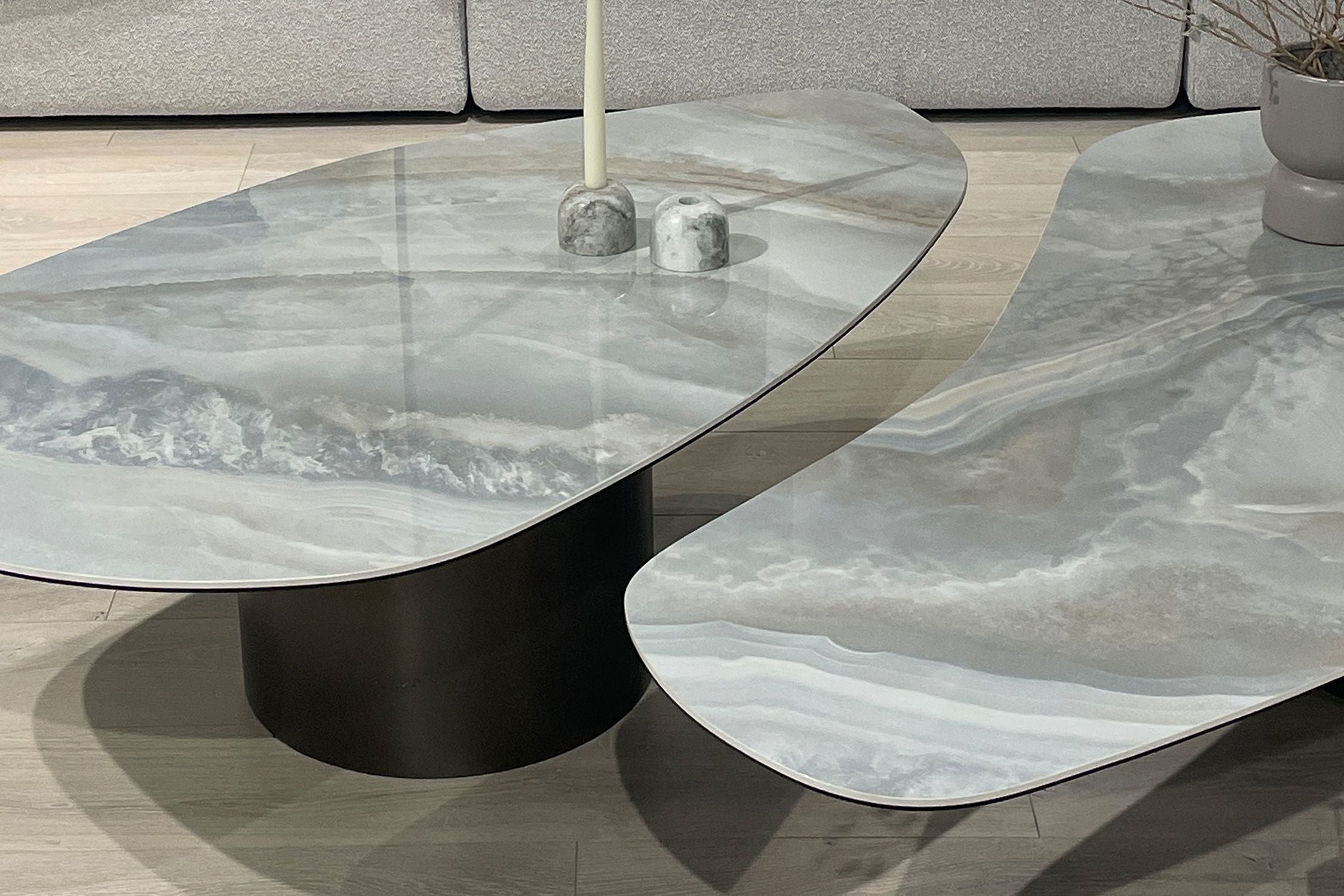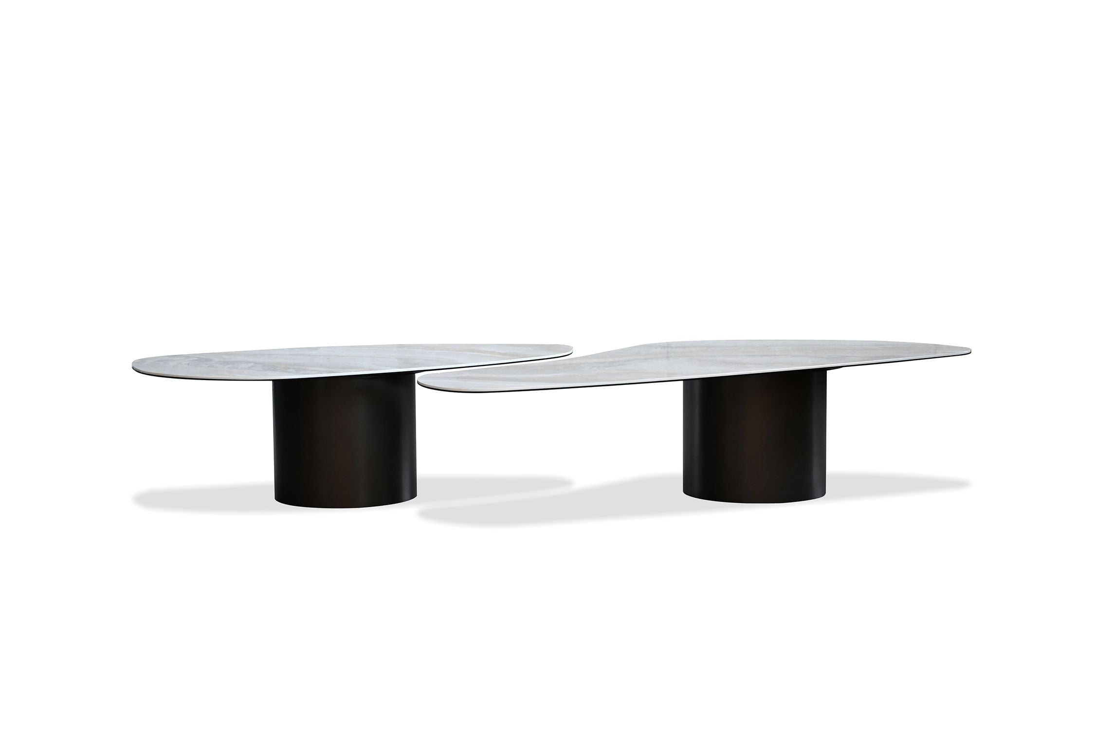 The WEDGE coffee tables combine practicality and style, featuring a durable onice grigio ceramic top and a deep brown, brushed-steel base. Available in two sizes, they nest perfectly together like puzzle pieces, creating an ideal pairing for larger sectionals or wider sofas.