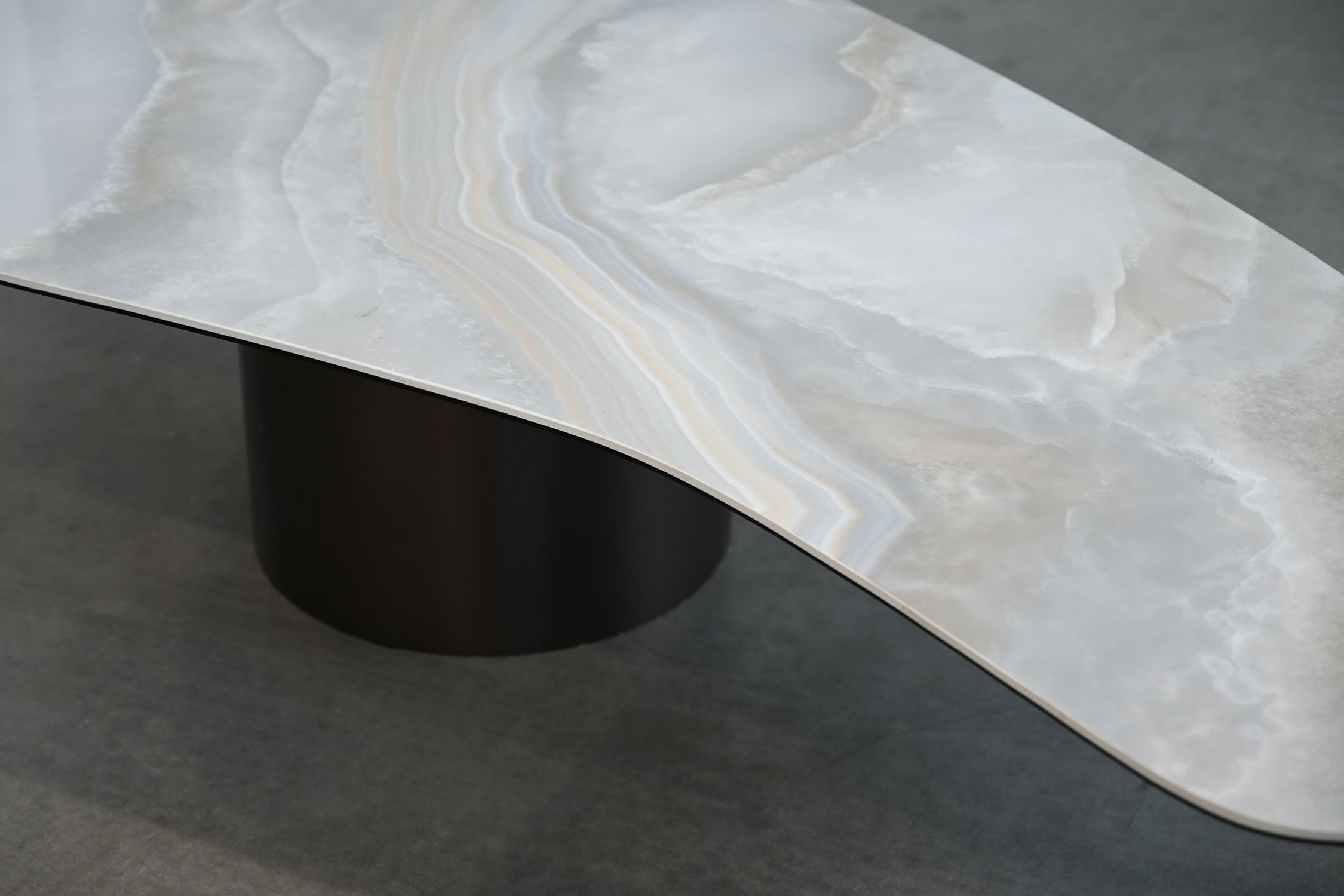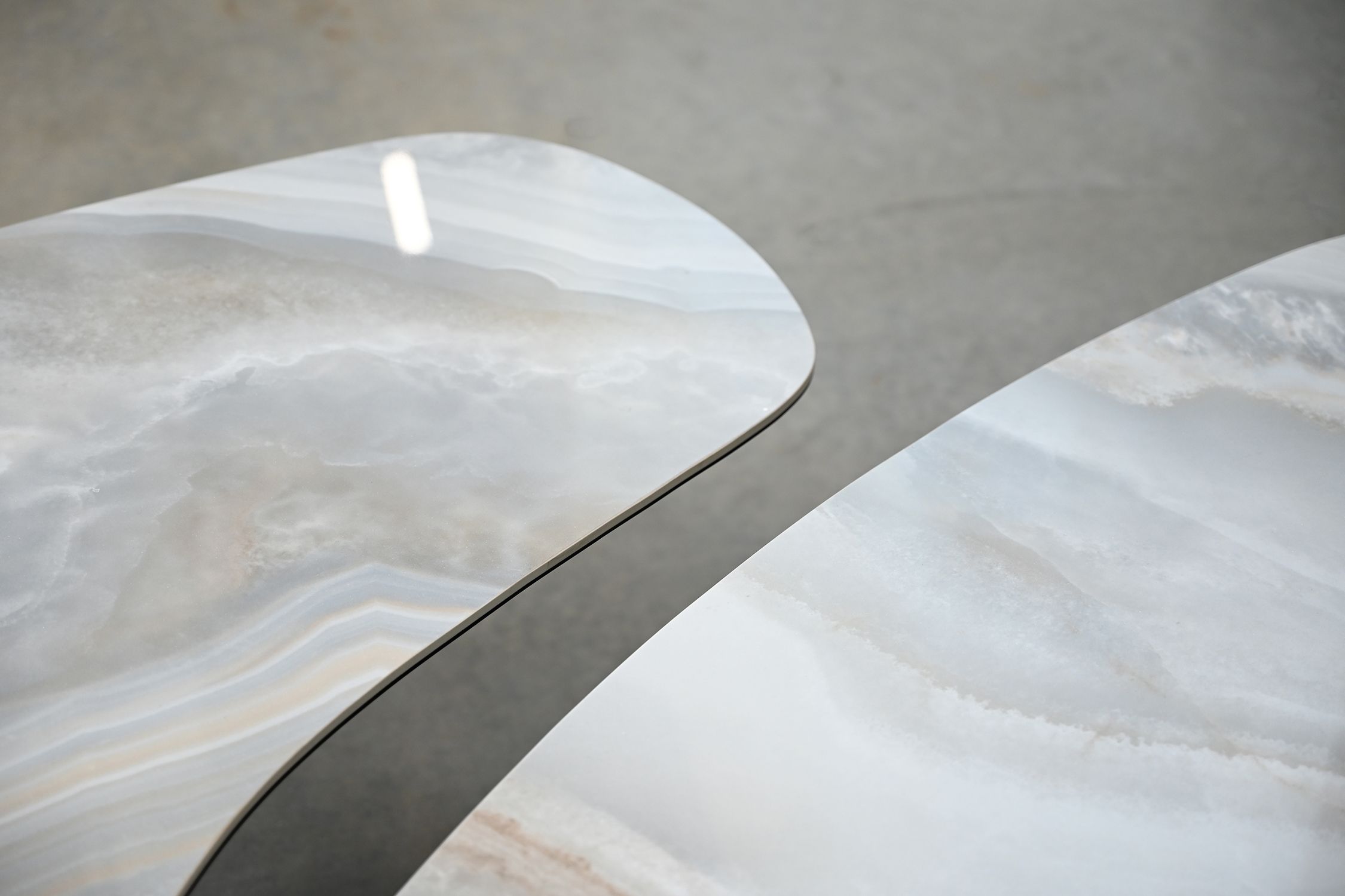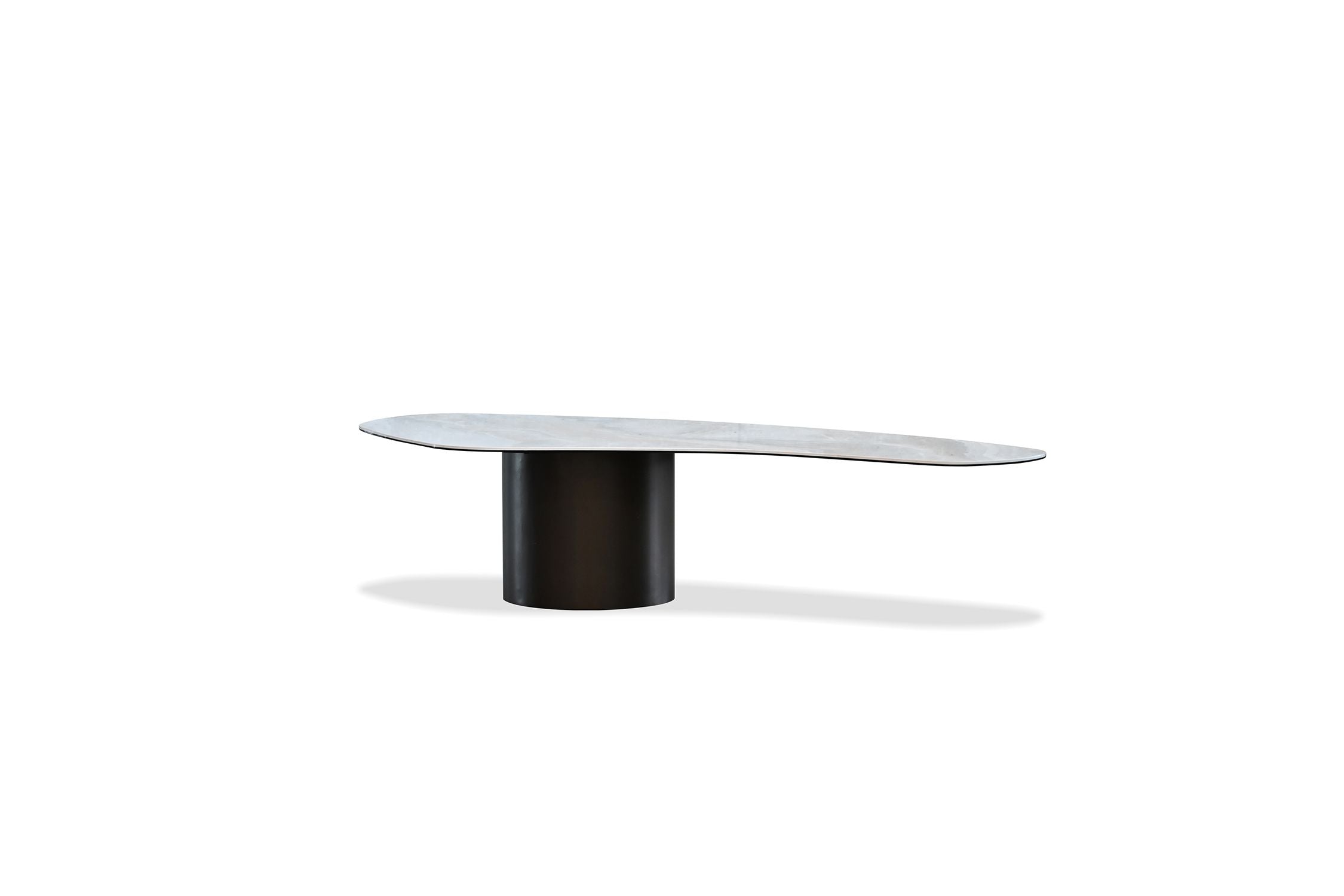 The WEDGE coffee tables combine practicality and style, featuring a durable onice grigio ceramic top and a deep brown, brushed-steel base. Available in two sizes, they nest perfectly together like puzzle pieces, creating an ideal pairing for larger sectionals or wider sofas.